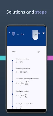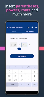 Main features: • Percentage calculation: Enter a percentage and get the result immediately, with a detailed explanation of the steps taken. • Sum and difference percentage: Solve percentage combinations like 20-40% or 10+22% in seconds. • Advanced math keyboard: Easily enter percentages, powers, roots, repeating decimals, and more. • Intuitive interface: A clean and simple design for a stress-free calculation experience.